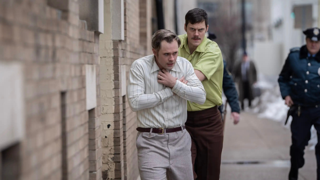 Van Sant wastes no time on his comeback. There are few films in recent memory that hit the ground running quite like this and within the first ten minutes Dead Man’s Wire is already in full sprint. Down on his luck Tony Kiritsis (Bill Skarsgård), has kidnapped Meridian Mortgage president Dick Hall (Dacre Montgomery), parading him through the streets of Indianapolis with a shotgun wired to his neck as police and opportunistic news crews look on in disbelief.